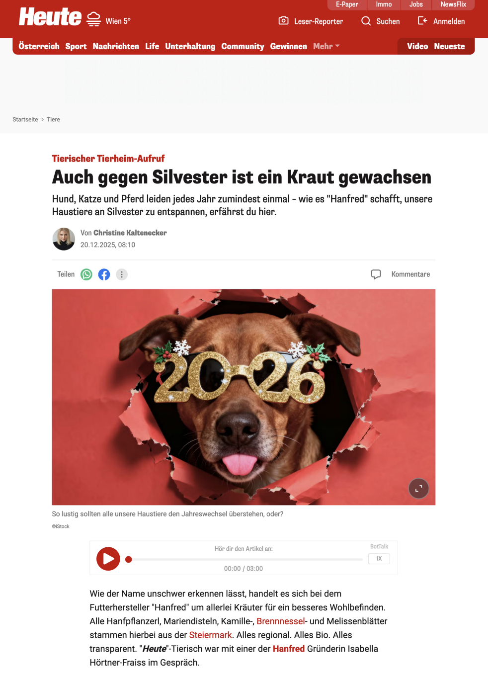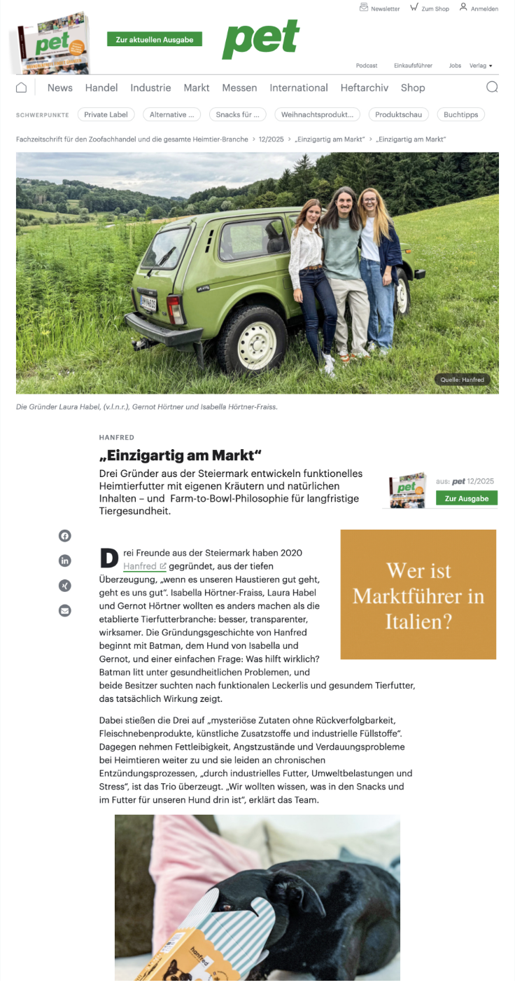 Within less than six weeks, hanfred appeared in over 60 media outlets across Germany and Austria, including lifestyle, general-interest, and pet media as well as radio. Coverage spanned titles such as Grazia, Sheconomy, pet Fachmagazin, HEUTE.at, and Kronehit Radio – driven in large part by a fast-turnaround New Year's Eve and animal shelter initiative delivered within just four weeks.