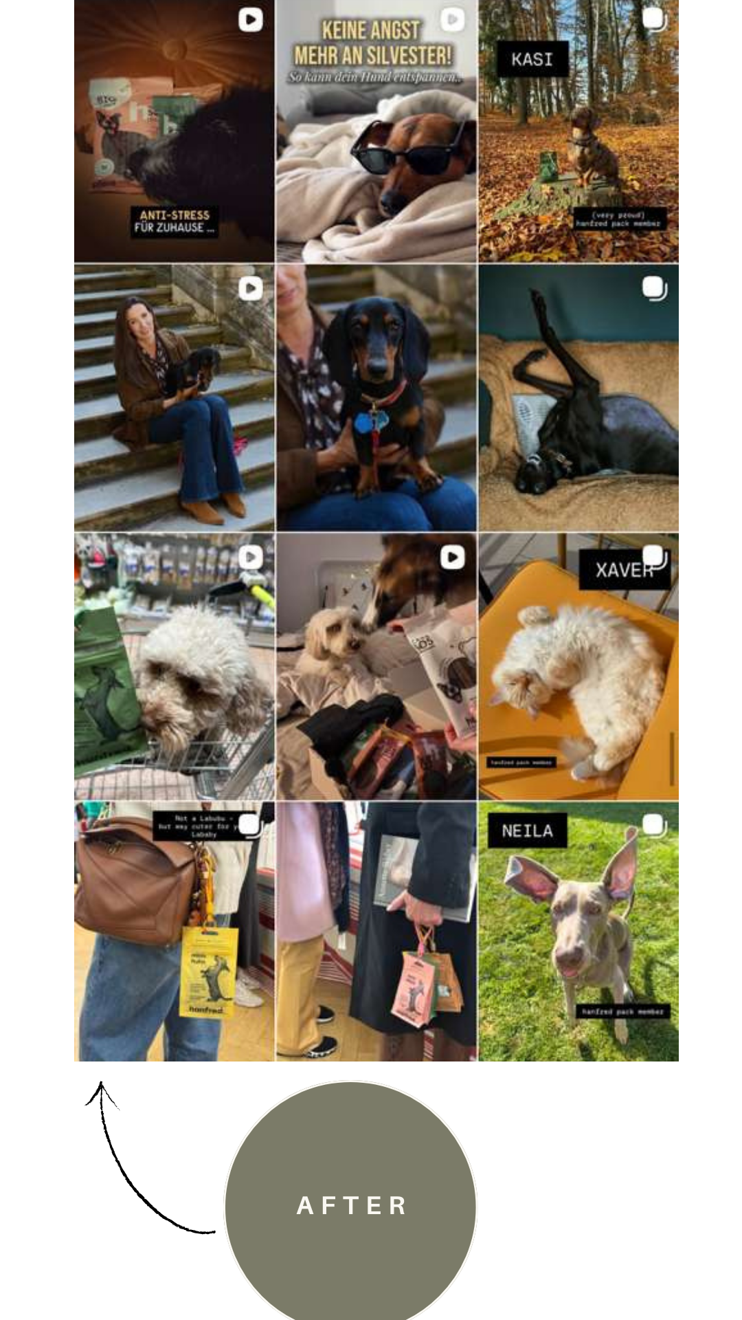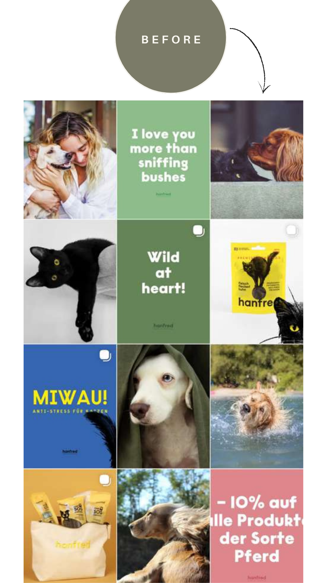 This resulted in clearly defined brand pillars that now guide all communication and ensure consistency across channels. Verbally and visually, hanfred evolved from a more technical positioning such as “Premium Hemp Food” towards a warmer, more emotional “Feel-Good Pet Food” approach. The creative direction followed this shift, moving away from generic stock imagery towards authentic, emotional visuals that reflect real pet–owner relationships.
